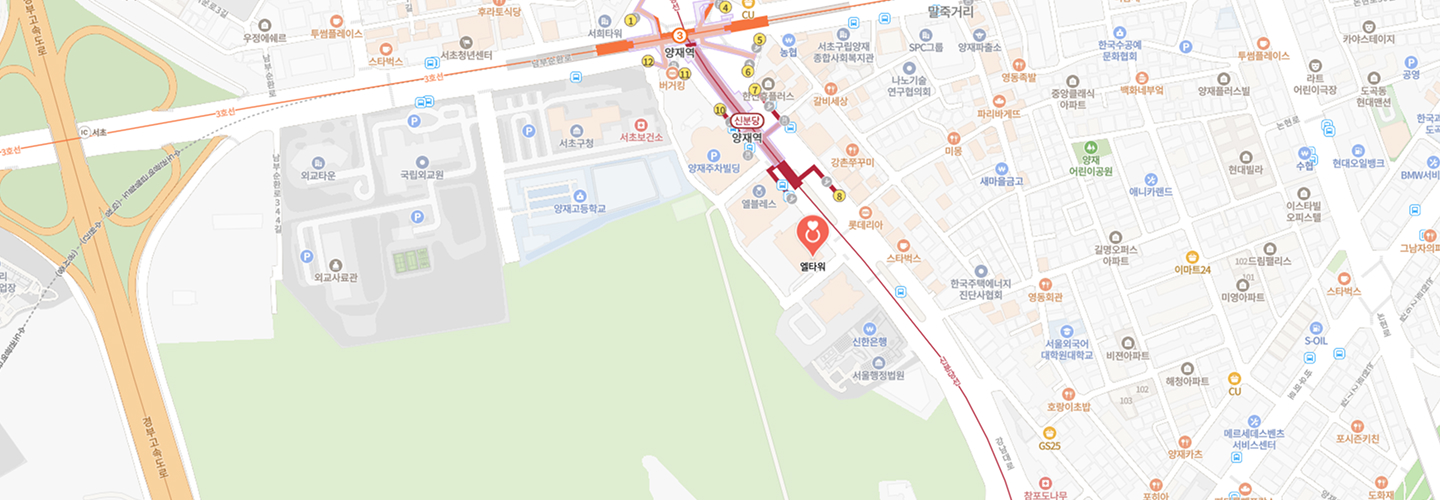 서초IC에서 양재역 방면으로 나오신 후 양재역사거리에서 성남방향으로 우회전합니다. 우회전 후 100m 직진하시면 우측에 엘타워가 있습니다.