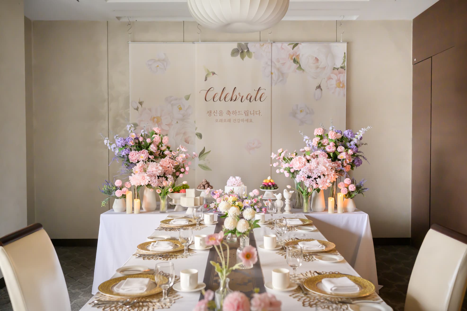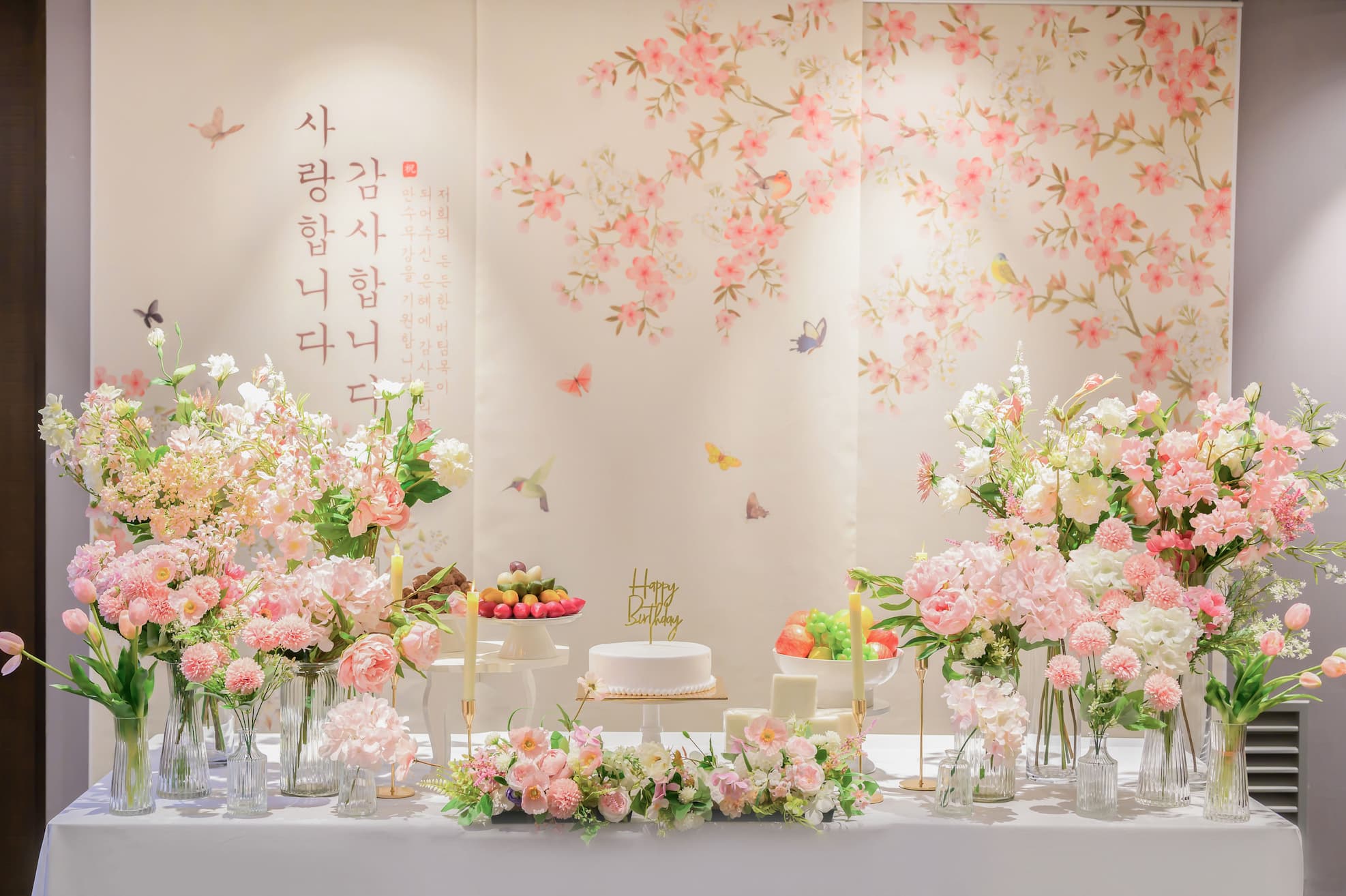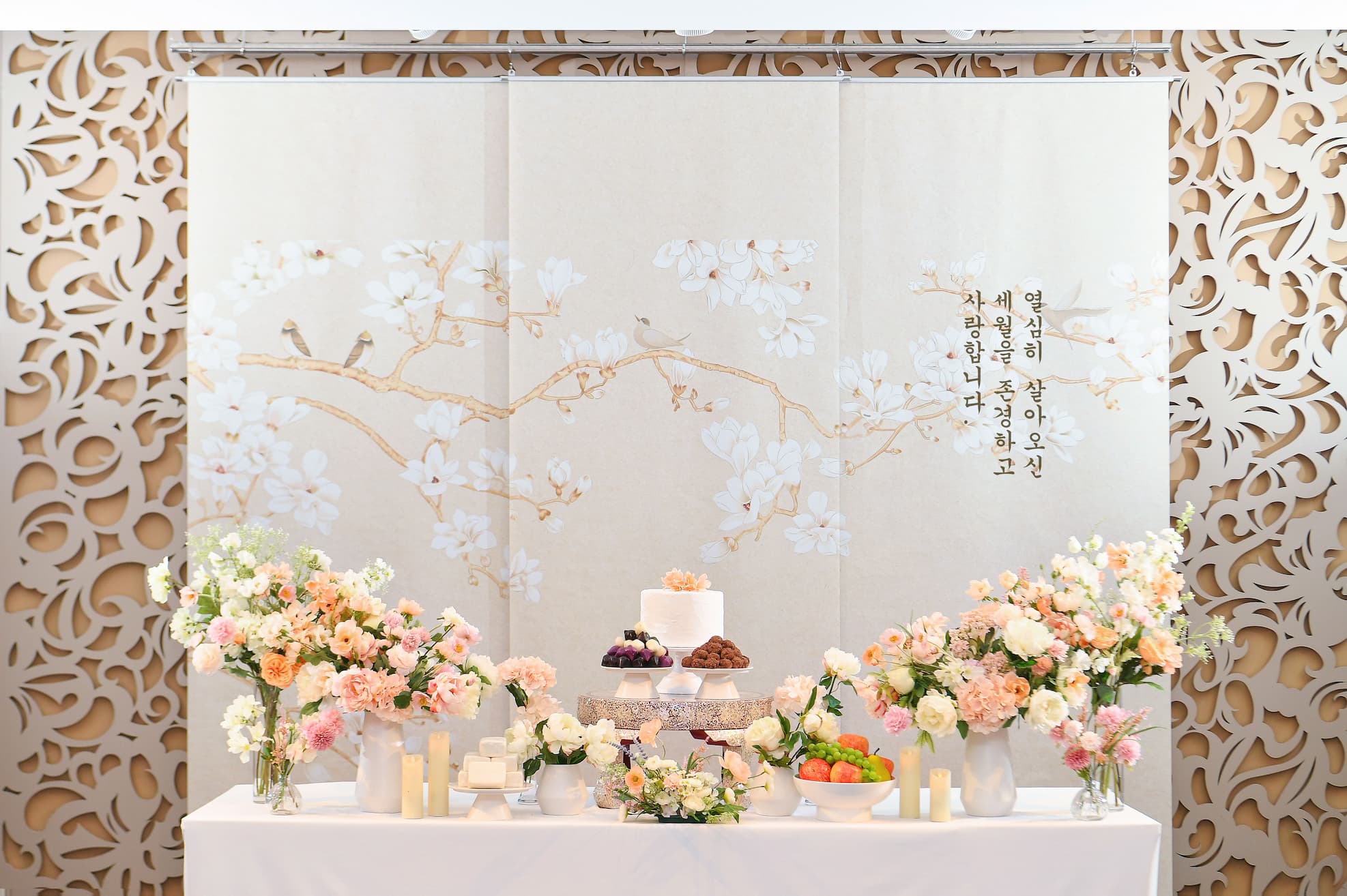 ※ 주최측에서 준비한 이름 현수막은 D5, D8 룸에 한하여 빛담, 청천 상차림 선택 시 세팅 가능합니다. ※ 상차림 구성과 컨셉은 기간에 따라 변경될 수 있습니다.